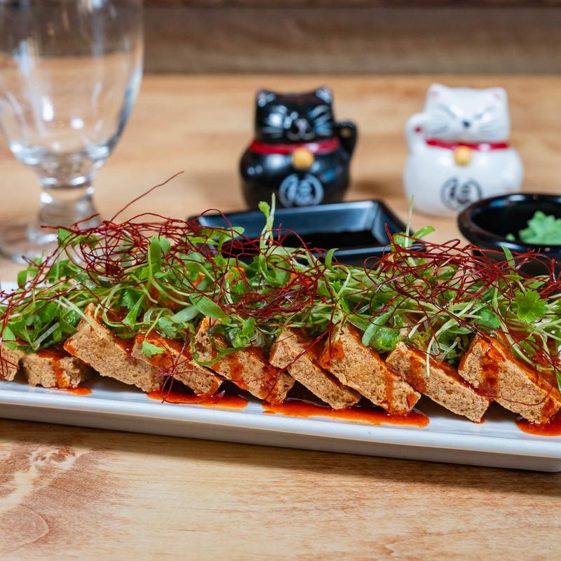 Spicy. Fried tofu with spicy sauce, sesame seeds, cilantro, chili threads.