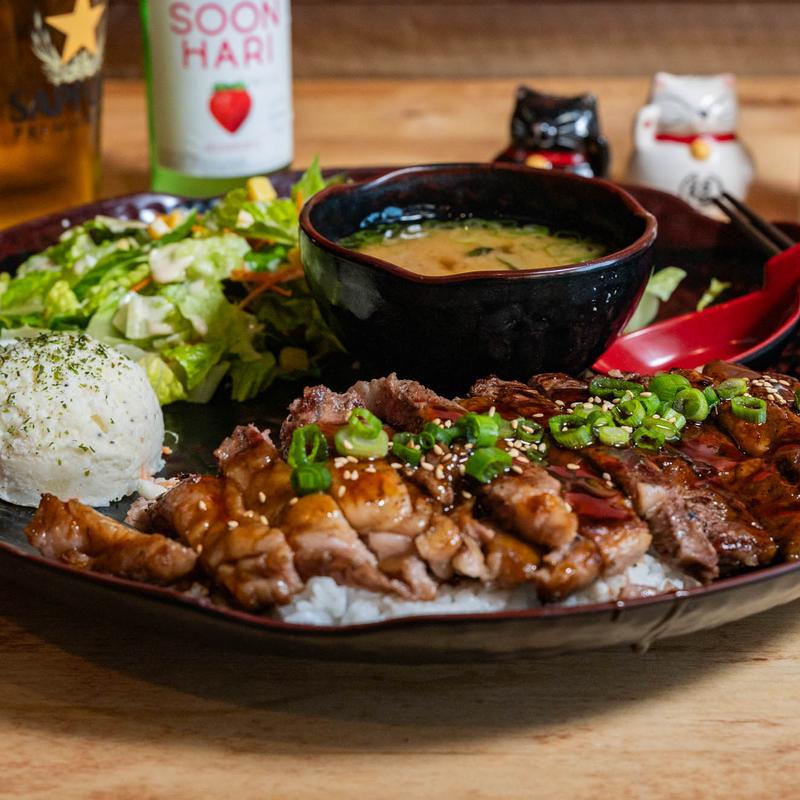 Shrimp flavor chicken broth, fried shrimps, seasoned egg, fish cake, marinated bamboo, bean sprouts, green onion, cilantro, seaweed, and sesame seeds.